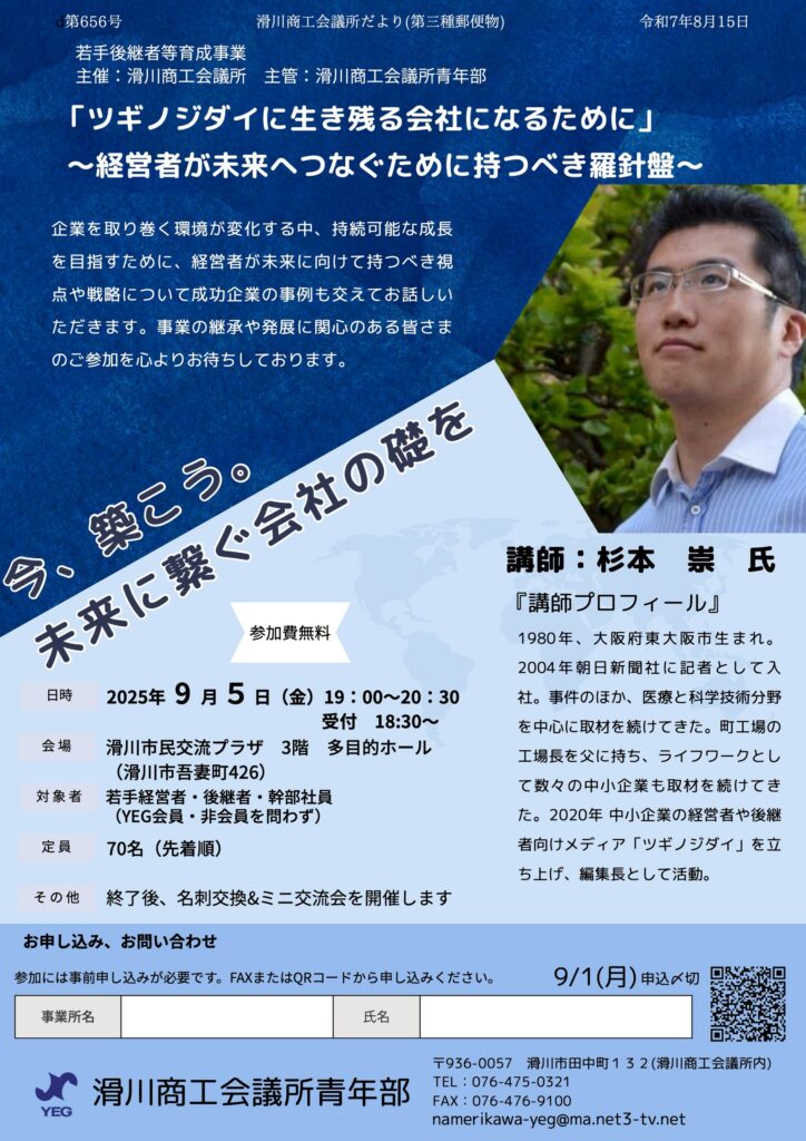 滑川商工会議所青年部では、令和7年度の若手後継者等育成事業の一環として、講演会を開催いたします。